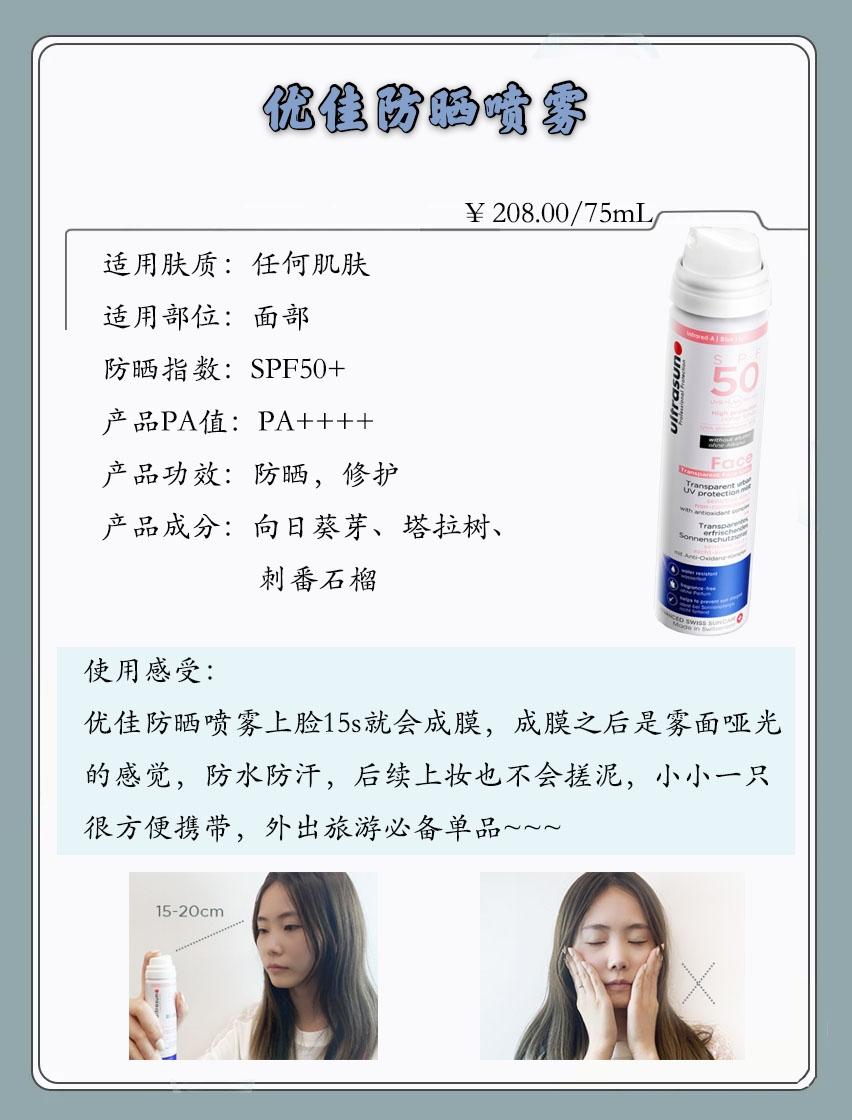 優(yōu)佳防曬噴霧在夏天用完也不怕油光搓泥,上臉15s就會成膜,成膜之后是霧面啞光的感覺,防水防汗,后續(xù)上妝也不會搓泥~~