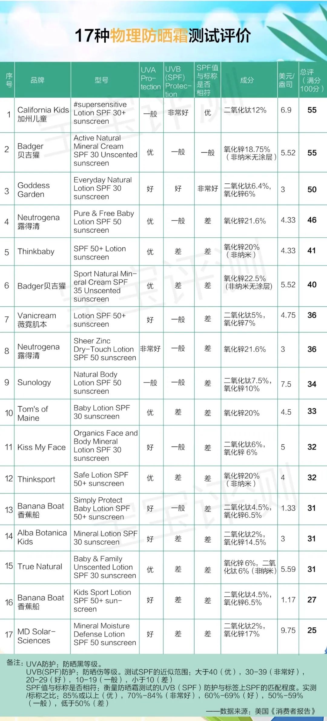 物理防曬雖然,但防曬功普遍是不如化學防曬的,在美國《消費者報告》測試過的物理防曬品牌中,普遍得分不高。