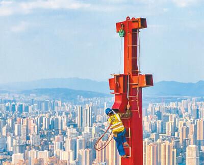 施工人員在重慶陸海國(guó)際中心項(xiàng)目主塔樓樓頂進(jìn)行施工作業(yè)。何 超攝(新華社發(fā))