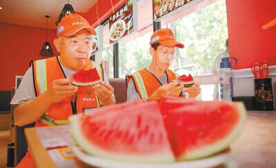 石家莊市橋西區(qū),環(huán)衛(wèi)職工正在“愛(ài)心驛站”里吃西瓜解暑。張文靜攝(影像中國(guó))