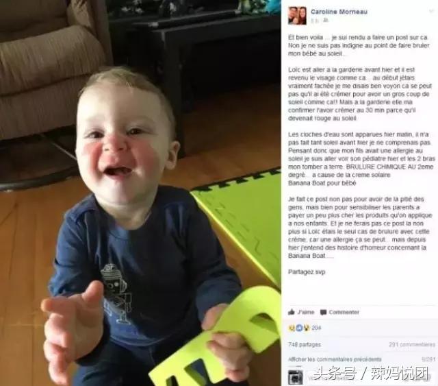 Caroline Morneau是一個9個月的男孩,也是使用防曬霜后面部灼傷