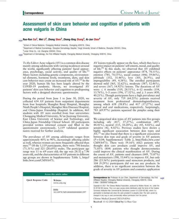 理膚泉聯(lián)合中國痤瘡人群影像數(shù)據(jù)庫在2020年新發(fā)布的《中國痤瘡患者皮膚護理行為與認知調(diào)查報告》。該報告納入了對中日友好醫(yī)院、上海交通大學(xué)醫(yī)學(xué)院附屬仁濟醫(yī)院、上海交通大學(xué)醫(yī)學(xué)院附屬第九人民醫(yī)院、上海市皮膚病醫(yī)院等4家三甲醫(yī)院、1000余位門診痤瘡患者的調(diào)查,調(diào)研結(jié)果發(fā)布在《中華醫(yī)學(xué)雜志英文版》上。