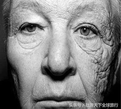 這張照片是他69歲時的樣子。右半邊臉的確是60多歲應有的樣子,但左半邊臉卻像是屬于一個耄耋之年的老者。而這就是紫外線在作祟。
