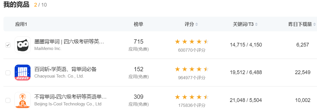 二、競(jìng)品選擇通過對(duì)比,墨墨背單詞、百詞斬,不背單詞擁有較為一致的市場(chǎng)以及用戶群體,都是將單詞記憶作為核心業(yè)務(wù),由此將不背單詞和百詞斬作為墨墨背單詞的直接競(jìng)品。根據(jù)下圖也可以看出,百詞斬和不背單詞的每日下載量和相關(guān)熱度均高于墨墨背單詞。