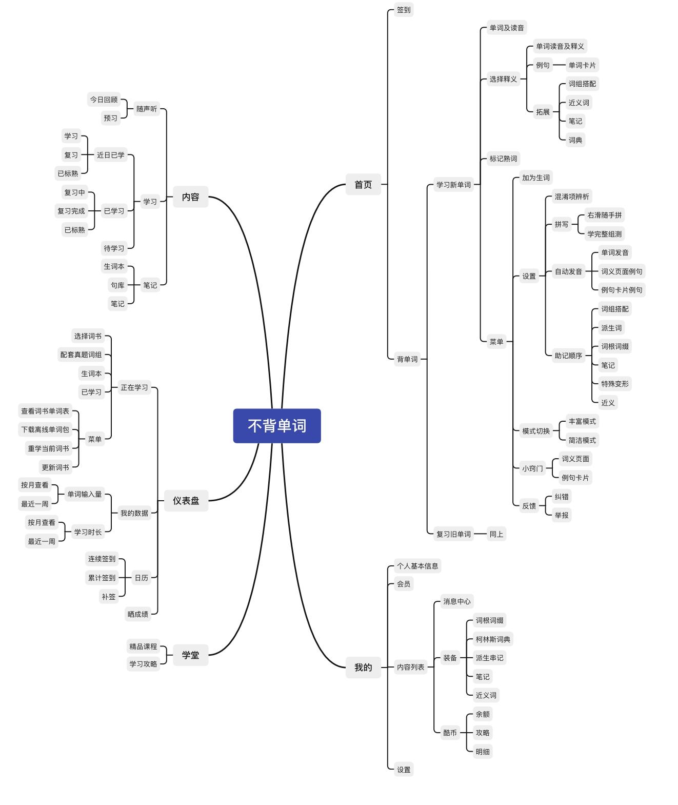 3. 產(chǎn)品結(jié)構(gòu)圖為了為直觀展現(xiàn)出墨墨背單詞、百詞斬和不背單詞三個(gè)APP的功能,以下是我繪制的結(jié)構(gòu)圖。