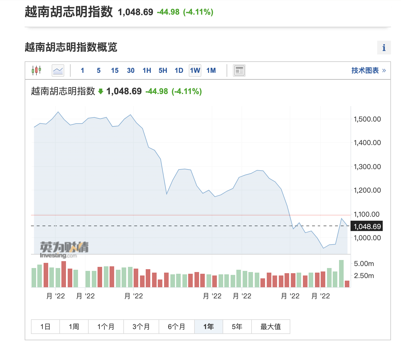 其中,越南股市已成為今年以來回報(bào)差的市場(chǎng)之一。數(shù)據(jù)顯示,截至12月8日,越南河內(nèi)指數(shù)年初至今大跌54.57%,超過俄羅斯MOEX指數(shù),在主要股指中位列倒數(shù)第一;越南胡志明指數(shù)較年初大跌幅超過40%,現(xiàn)回到30%左右的跌幅;越南VN30指數(shù)下跌幅度也達(dá)約30%。