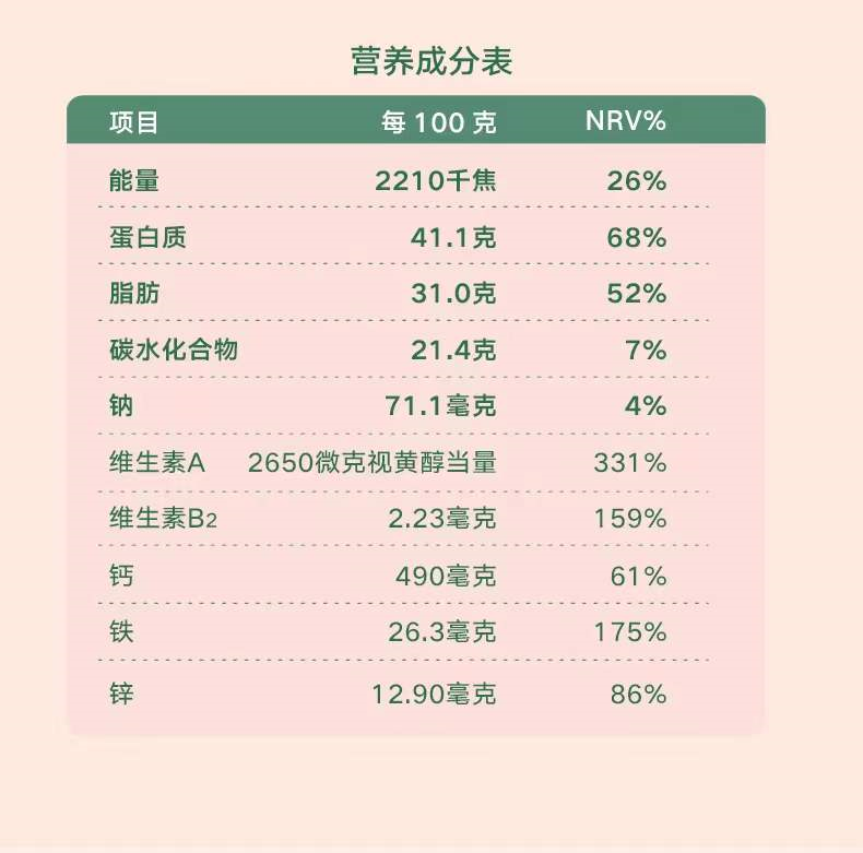 以1歲寶寶每天需要額外攝入4mg鐵為例,需要吃15g豬肝粉,差不多要5包該品牌豬肝粉。同時,寶寶也攝入了約397.5ug RAE的維生素A,已經(jīng)超過了適宜攝入量310ug RAE。
