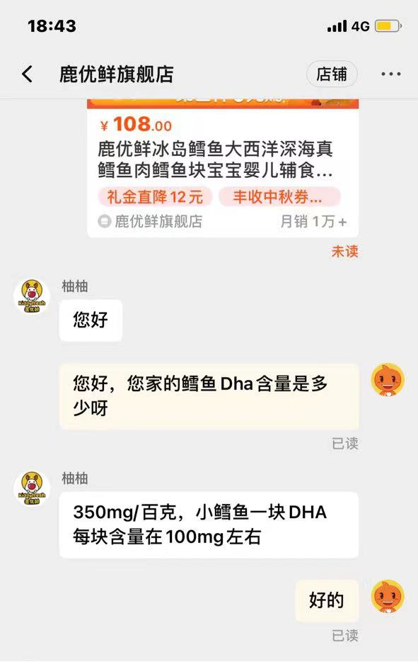 電商平臺上有這么兩款鱈魚銷冠王——鹿優(yōu)鮮、優(yōu)品悅動,都宣稱自己每100克魚肉含有350毫克DHA,而且客服也再三。