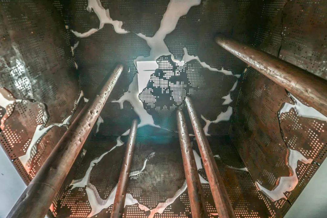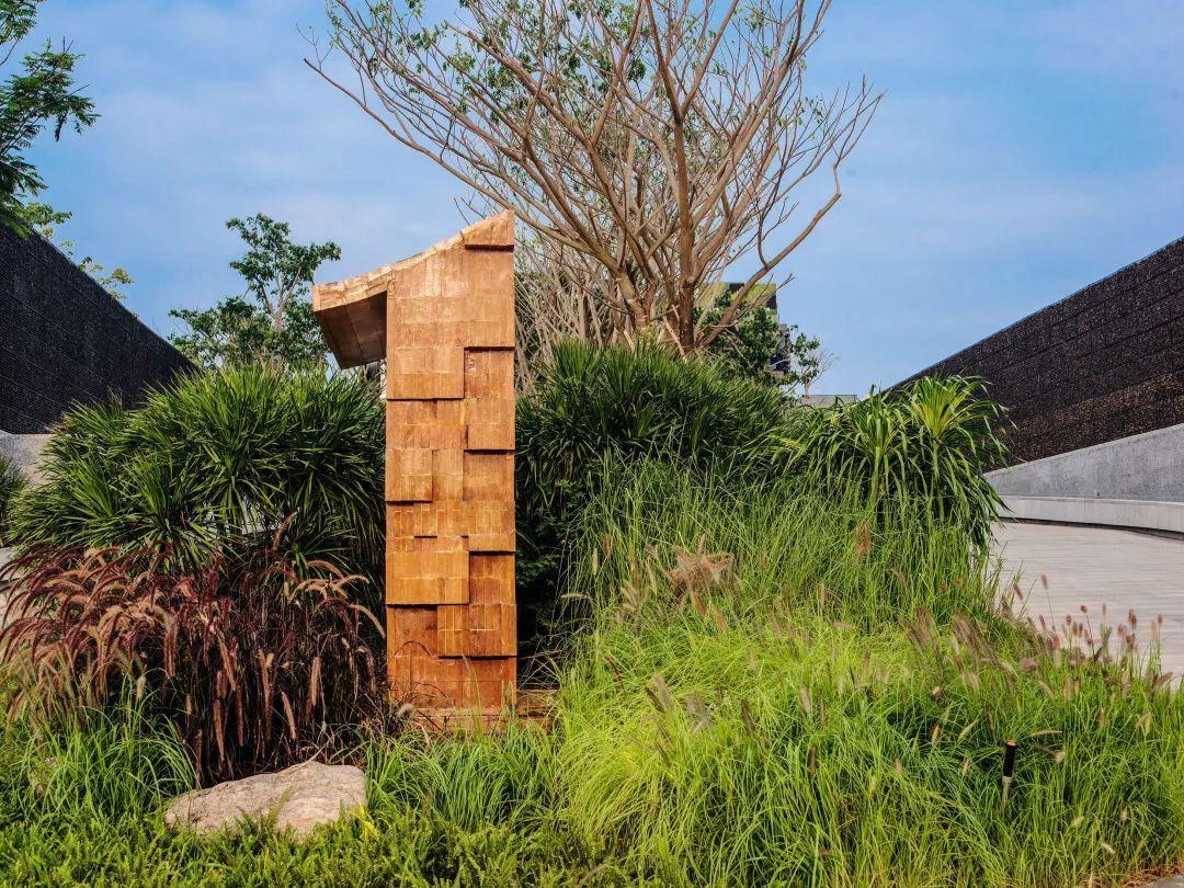 穿過(guò)“銹跡斑斑”的門(mén)臉來(lái)到大堂,來(lái)自新加坡的新銳設(shè)計(jì)師事務(wù)所FARM以海南島繁茂的熱帶雨林景觀為參照,用鋼制風(fēng)化樹(shù)干撐起了這片空間。