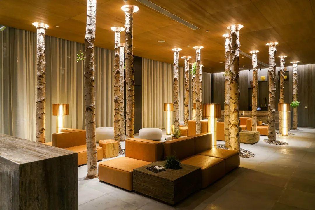 繞過(guò)“雨林”般的大堂,映入眼簾的是由從大興安嶺回收的白樺樹(shù)干撐起的團(tuán)隊(duì)接待區(qū)。而且令人欣喜的是,個(gè)別原本已經(jīng)枯死的樹(shù)干來(lái)到酒店后居然煥發(fā)了第二次生命,冒出了綠葉。