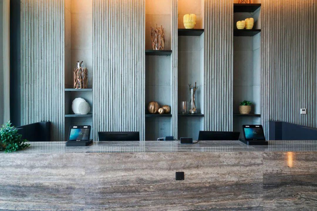 挑高吊頂?shù)幕厥张f鐵皮被巧妙地鑄成了“樹(shù)蔭”,任鏤空處的自然光肆意揮灑。接待處被點(diǎn)綴著綠植的石墻包裹,前臺(tái)原木背景墻上的水紋木雕恰到好處。