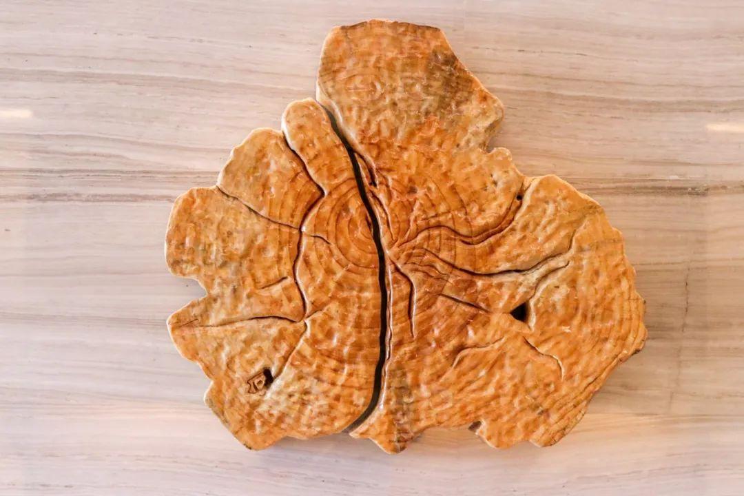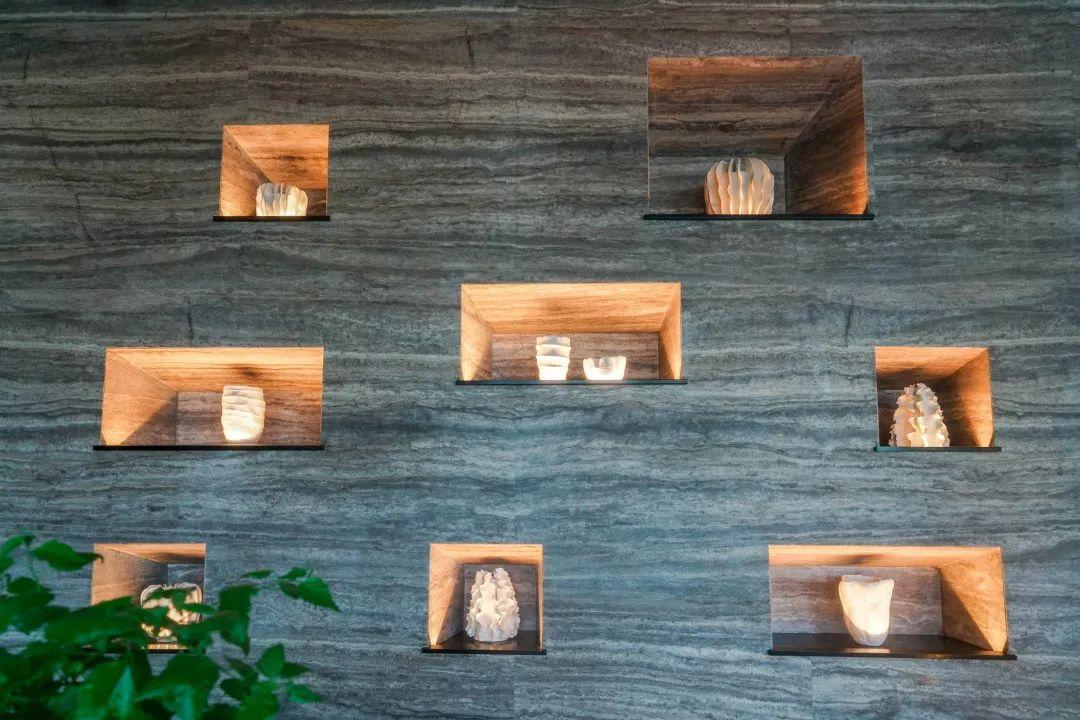 前臺(tái)接待處和一旁石墻的藝術(shù)品陳列架上,各式擺件也多以大自然為主題