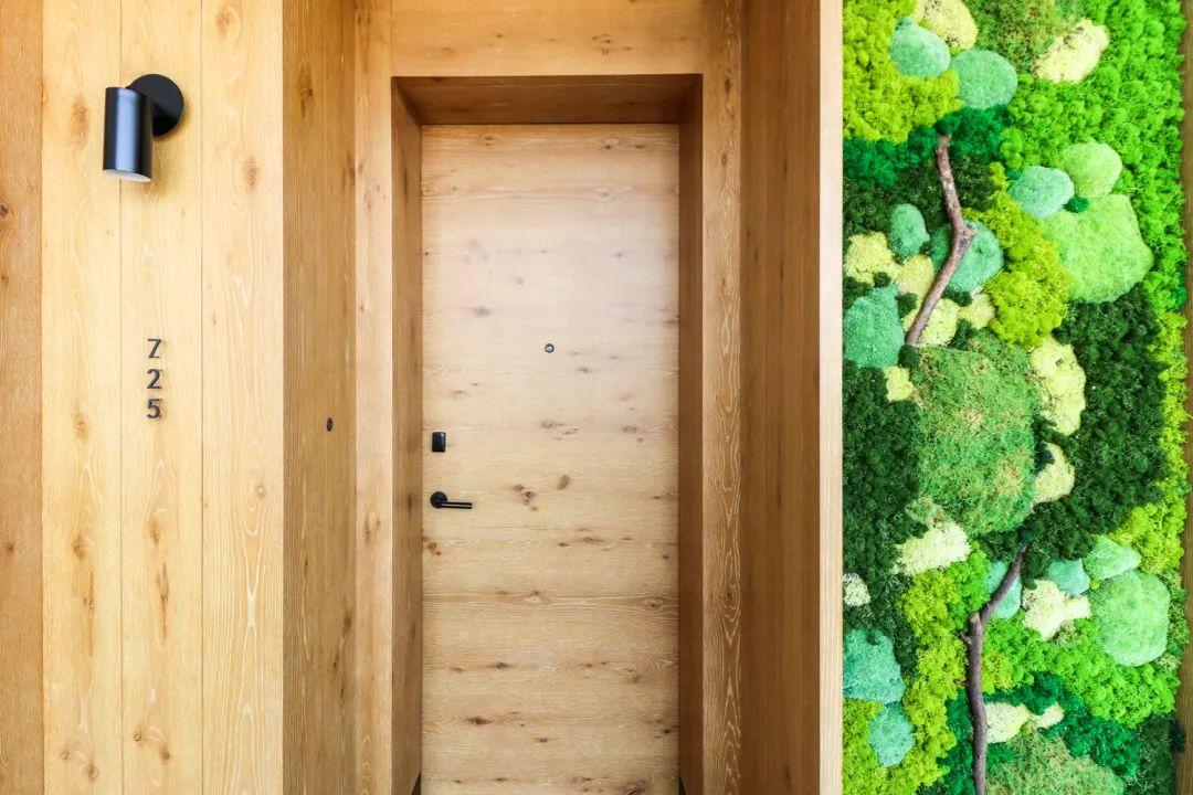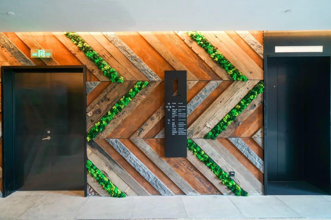 電梯廳、電梯內(nèi),和客房公區(qū)走廊的裝飾采用了從本地回收的廢舊船木和鐵軌枕木。裝點(diǎn)的藻類植物雖經(jīng)過(guò)調(diào)色但卻是真?綠植。