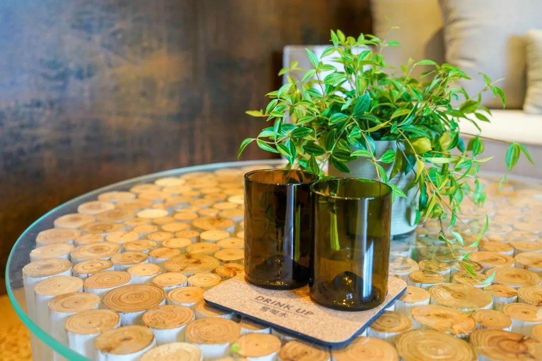 茶幾的基座則由一根根細(xì)樹(shù)干粘合而成,水杯的原型則是回收來(lái)的紅酒瓶。