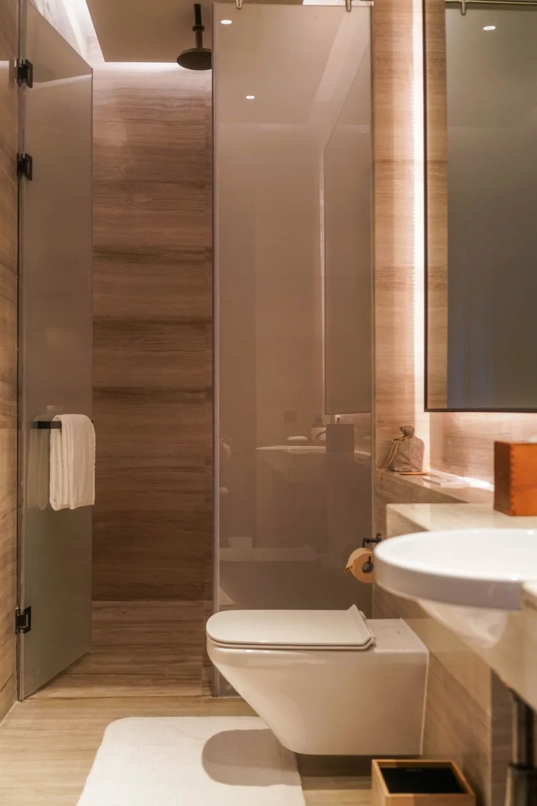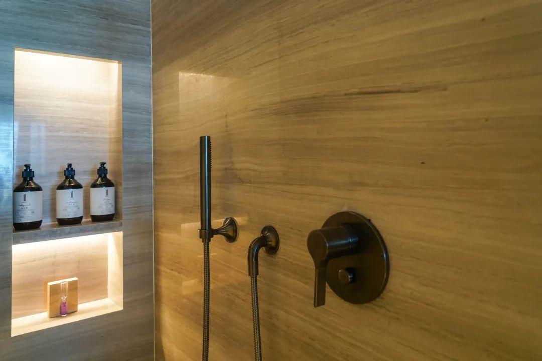 高級(jí)灰的步入式浴缸散發(fā)著冷峻的現(xiàn)代工業(yè)風(fēng),鑲嵌于底部的花瓣燈飾則增添了幾分浪漫和柔美。