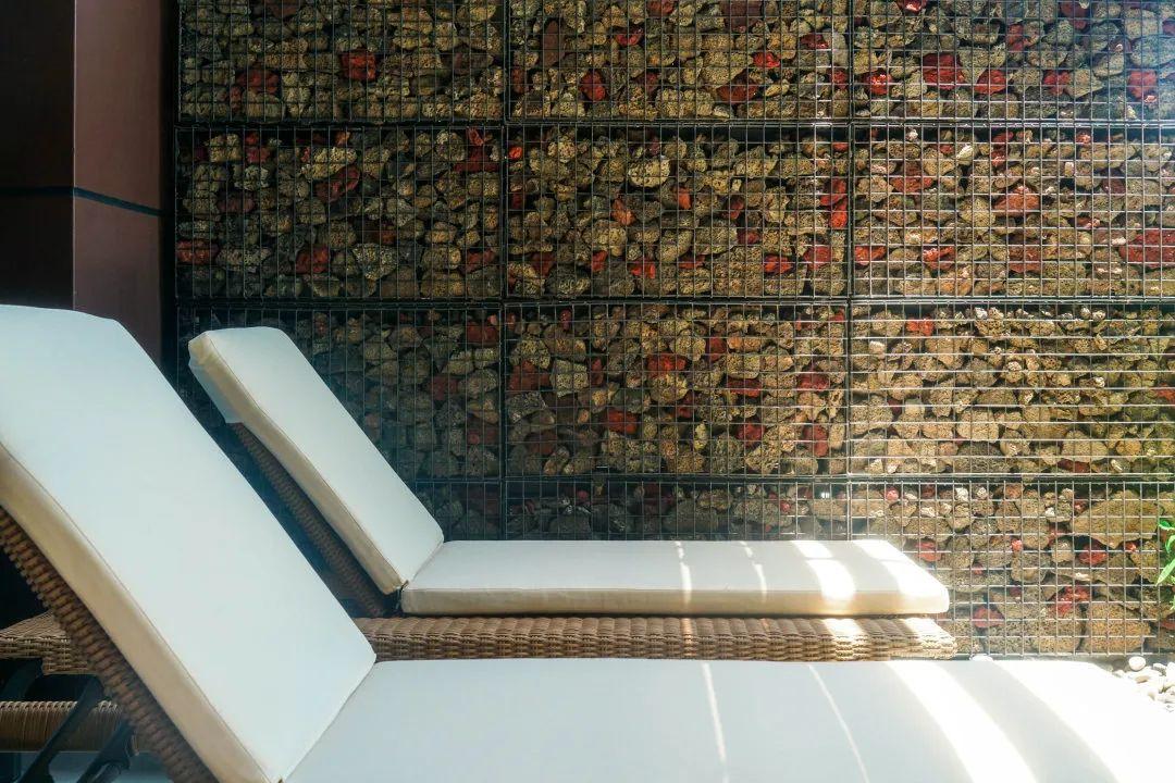 鑒于酒店拔高的基地地形,落客區(qū)實(shí)際設(shè)在了主樓的3層。通透的開(kāi)放式庭院有著小草點(diǎn)綴的步道和鵝卵石襯托的水景。就地取材于海南本地的火山石被一個(gè)個(gè)鐵籠規(guī)整成了背景墻,透著在度假酒店里并不多見(jiàn)的粗糲感,酷。而墻面留白的鏤空l(shuí)ogo,則成了很多客人都會(huì)拍照留念的打卡點(diǎn)。