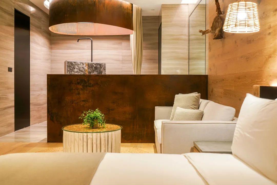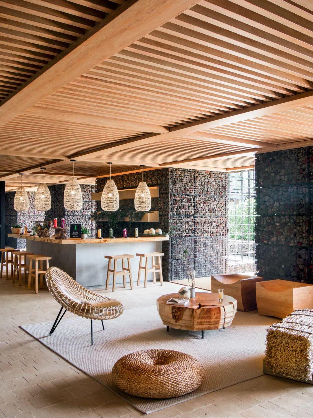 更大的空間也給了環(huán)保理念更多的展示空間。起居室原木背景墻上的樹(shù)根、木質(zhì)的沙發(fā)底座、麻繩編織的椅子側(cè)翼,以及藤編的座榻,無(wú)不展現(xiàn)著可持續(xù)發(fā)展的環(huán)保理念所賦予這些物料的第二次生命。