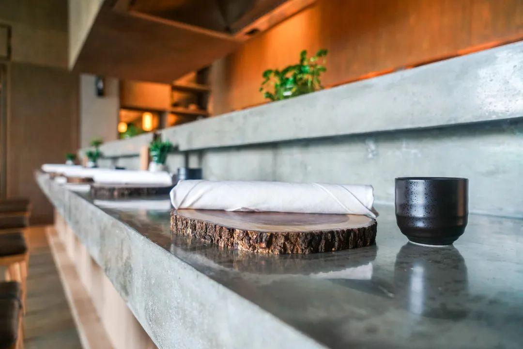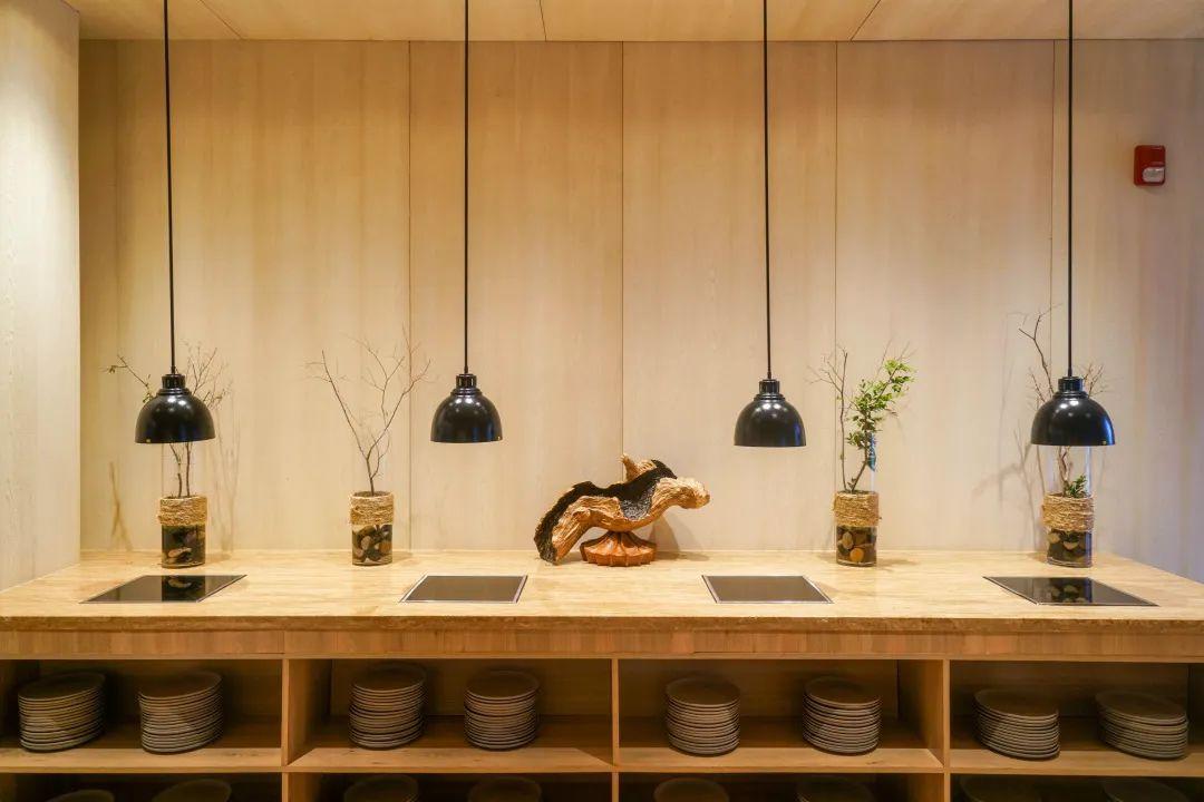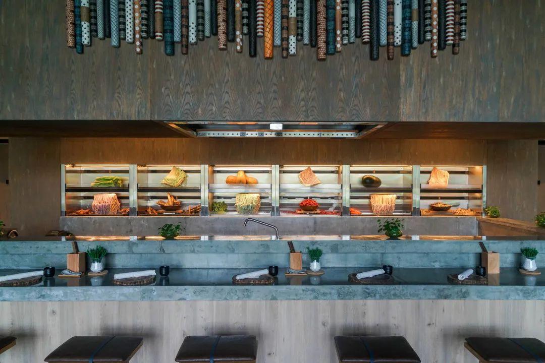 餐廳整體氛圍接地氣,尤其吧臺(tái)前的一圈板凳,以及需要自取的筷子,像街邊地道的面館。木樁打薄后做成的展示盤(pán)則延續(xù)了環(huán)保主題。