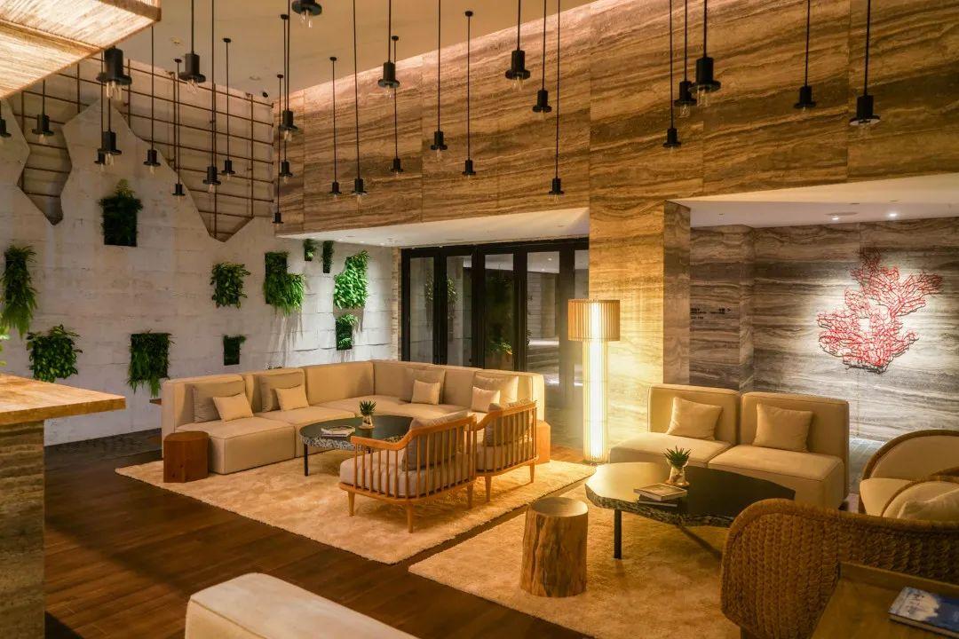 大堂彌漫著融合了雪松、橡木,和桉樹(shù)葉的特調(diào)香氛,外加綠植的點(diǎn)綴,以及裝潢對(duì)海南熱帶雨林的形象傳達(dá),使得整個(gè)都空間都充滿了大自然的氣息