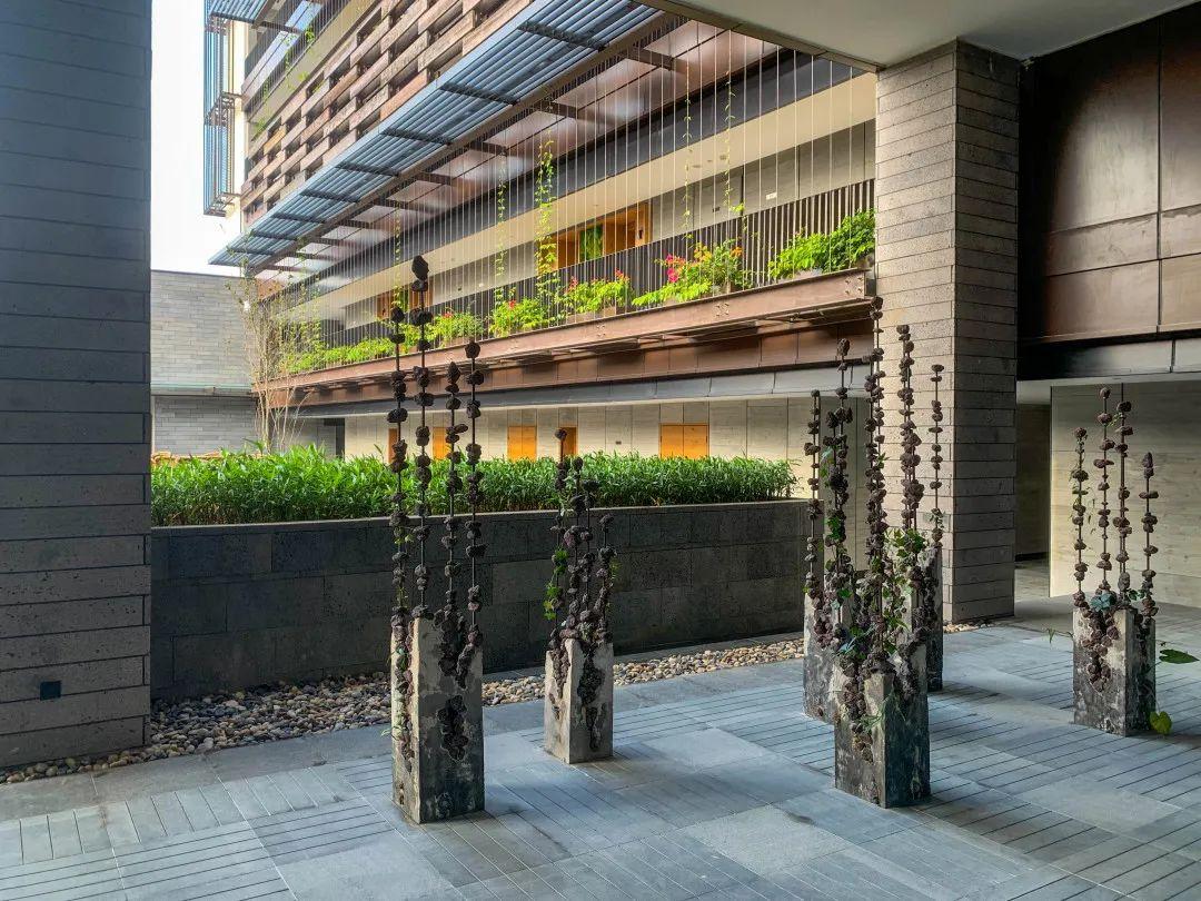 樓頂覆蓋著的綠植促成了一個(gè)個(gè)空中花園,兒時(shí)記憶中的狗尾巴草在風(fēng)中飄搖。建筑外墻甚至留出了給藤曼植物向上攀爬的架子