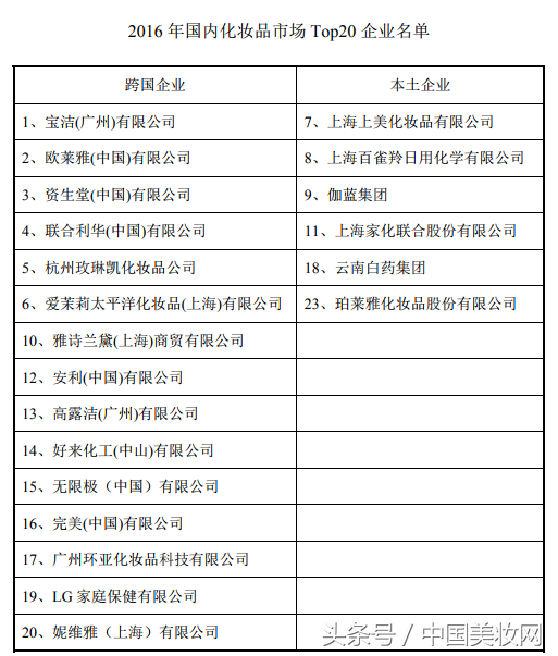 在歐睿數(shù)據(jù)發(fā)布的2016年國內(nèi)化妝品市場Top20企業(yè)名單中,上美公司排名第七,在本土企業(yè)中排在第一位。排在第8、9、17位的分別是百雀羚、伽藍(lán)集團(tuán)和環(huán)亞集團(tuán)。