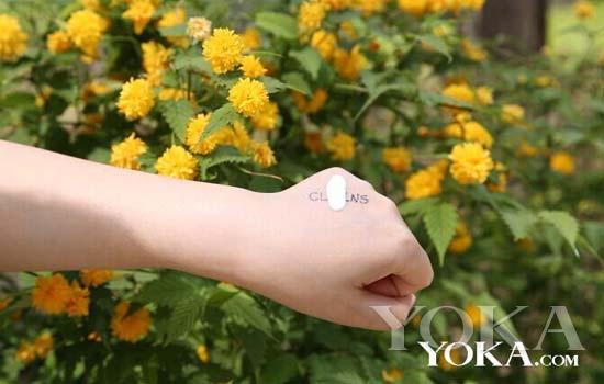 編輯在拍攝前在手背上寫了嬌韻詩的英文字母,之后把防曬乳擠在手背上,哇哦,流動性很強,看樣子就很清透不油膩,夏天選防曬產(chǎn)品就是要輕、薄、透。