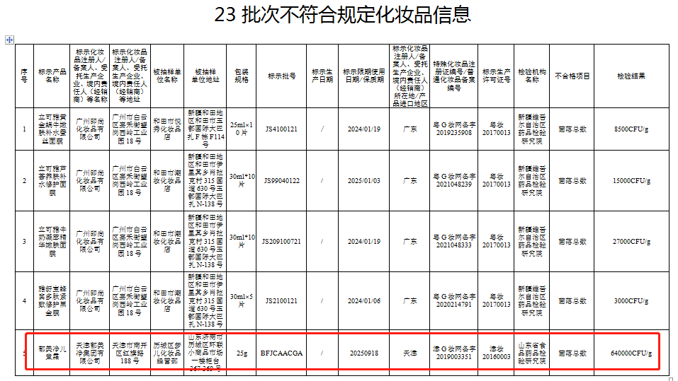 此次通告的23批次不符合規(guī)定化妝品多為面膜、染發(fā)、防曬類產(chǎn)品,抽檢發(fā)現(xiàn)的主要問題是菌落總數(shù)、成分比對項目不合格,部分批次檢出含量超過規(guī)定限值的苯基甲基吡唑啉酮。其中,標(biāo)示為天津郁美凈集團有限公司生產(chǎn)的(標(biāo)示批號:BFJCAACGA)郁美凈兒童霜被檢出菌落總數(shù)不合格,檢驗結(jié)果為640000CFU/g。