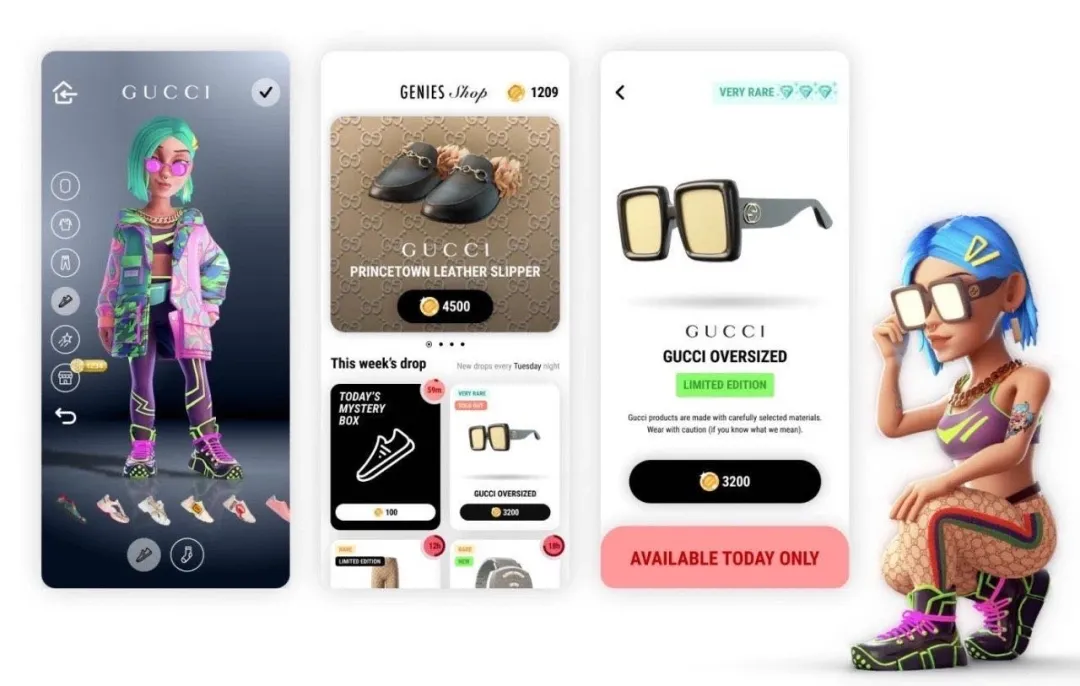 Horizon worlds的avatar形象還有一些時(shí)尚品牌借助avatar穿戴自己的產(chǎn)品,以次來(lái)凸顯品牌調(diào)性。品牌Gucci就與虛擬形象科技公司 Genies 合作,允許用戶創(chuàng)建自己的個(gè)性化虛擬形象進(jìn)行穿搭售賣。