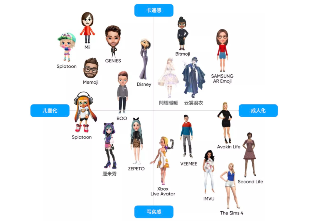 Avatar的不同呈現(xiàn)形態(tài)的根據(jù)“卡通感-寫(xiě)實(shí)感”、“兒童化-成人化”這兩組維度,可以得到視覺(jué)特征定位圖。其中第四象限是虛擬世界avatar形象超寫(xiě)實(shí)化的一個(gè)重要的發(fā)展方向。