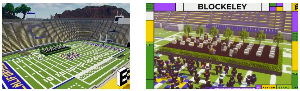 微軟旗下公司開(kāi)發(fā)的《我的世界》是一款和《Roblox》畫(huà)風(fēng)相似的開(kāi)放世界游戲。2020年加州大學(xué)伯克利分校還在《我的世界》里舉行了虛擬的畢業(yè)典禮,包含了現(xiàn)實(shí)流程中的校長(zhǎng)致辭、學(xué)位授予、拋禮帽等。