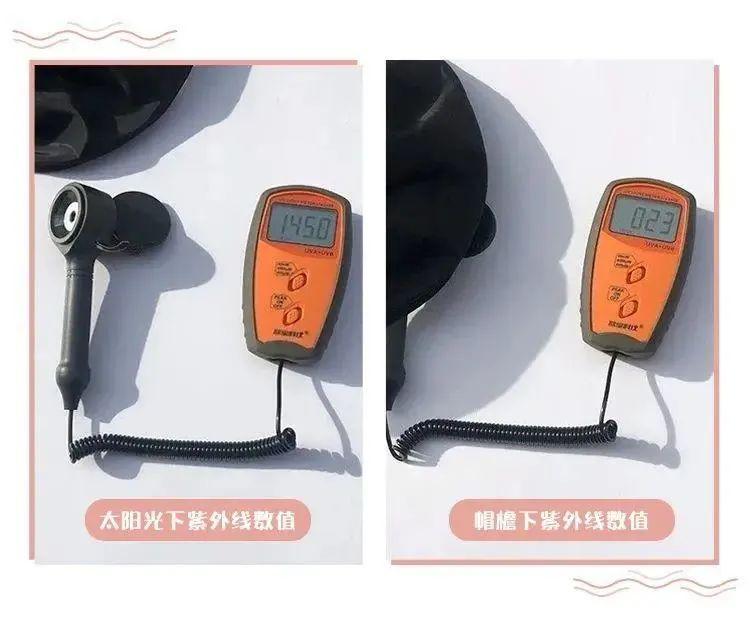 關(guān)于防曬力,NOZEWOWA直接拿檢測(cè)結(jié)果說話,同樣環(huán)境下,紫外線測(cè)試儀顯示:太陽光下數(shù)值為 1450,到帽檐底下瞬間降到了,23 紫外線強(qiáng)度幾乎可以忽略不計(jì)。