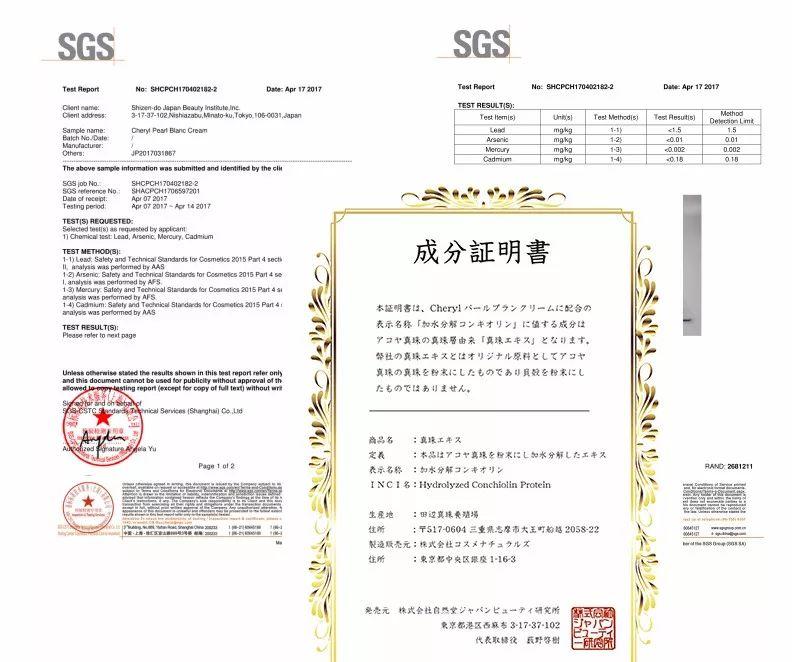 CHERYL阿古屋珍珠素顏UV霜通過日本SGS檢測(cè),報(bào)告給大家曬一曬。