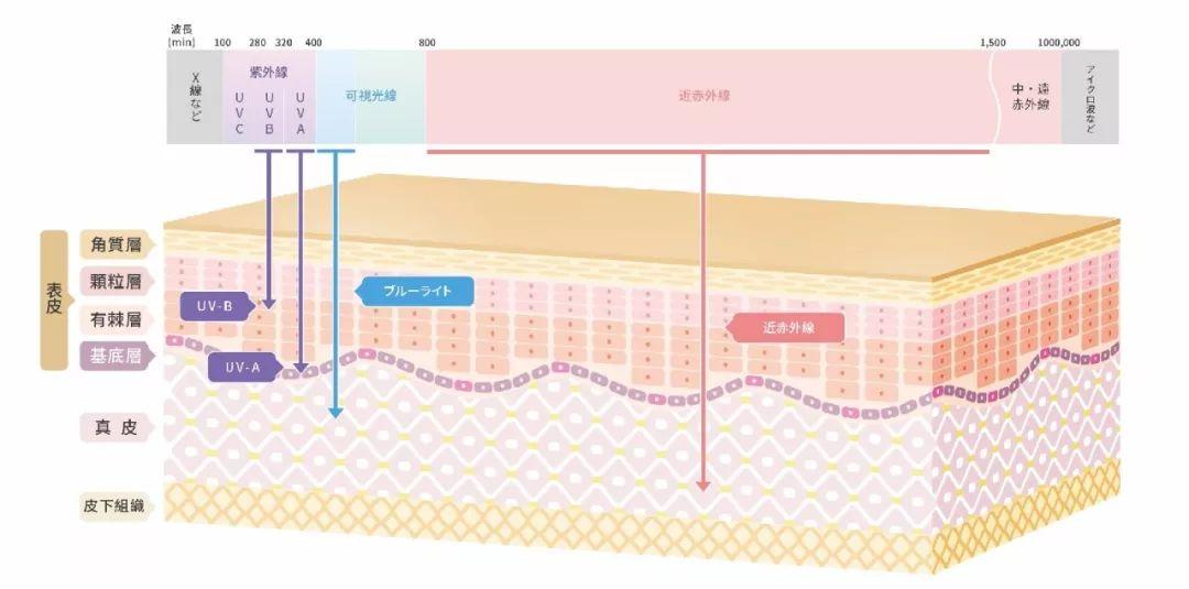 這其中UVC實(shí)力比較菜,臭氧層就能把它搞定,剩下兩個(gè)就比較強(qiáng)悍。UVB可以到達(dá)表皮層;UVA可以到達(dá)更深入的基底層,是皮膚黑化和老化的主要“元兇”;而藍(lán)光和近紅外線則可以損傷層,造成膠原纖維流失。