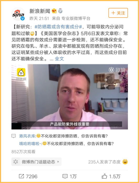 視頻的內(nèi)容說(shuō)米國(guó)做了個(gè)實(shí)驗(yàn),發(fā)現(xiàn)防曬霜的成分會(huì)被吸收進(jìn)入人體,可能會(huì)帶來(lái)健康隱患