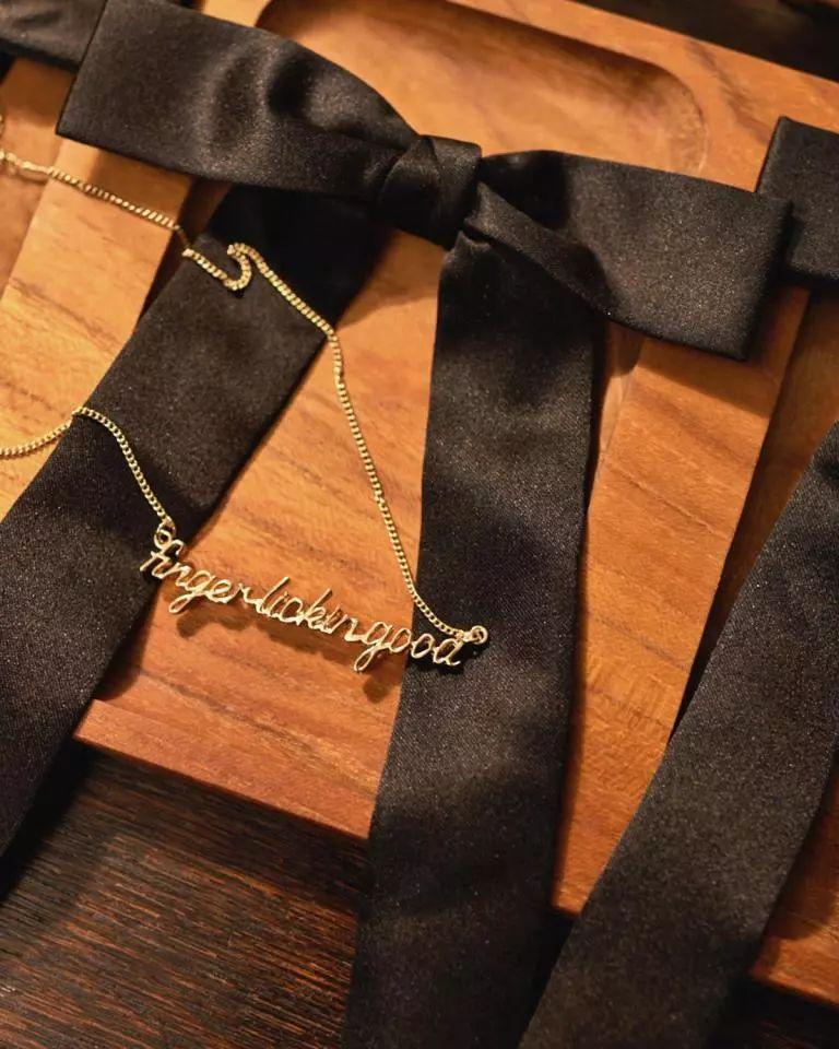 吮指原味雞的標(biāo)語“it’s finger lickin’good ” 變身成了項(xiàng)鏈,和肯德基爺爺?shù)暮谏I(lǐng)結(jié)組成個(gè)情侶飾品