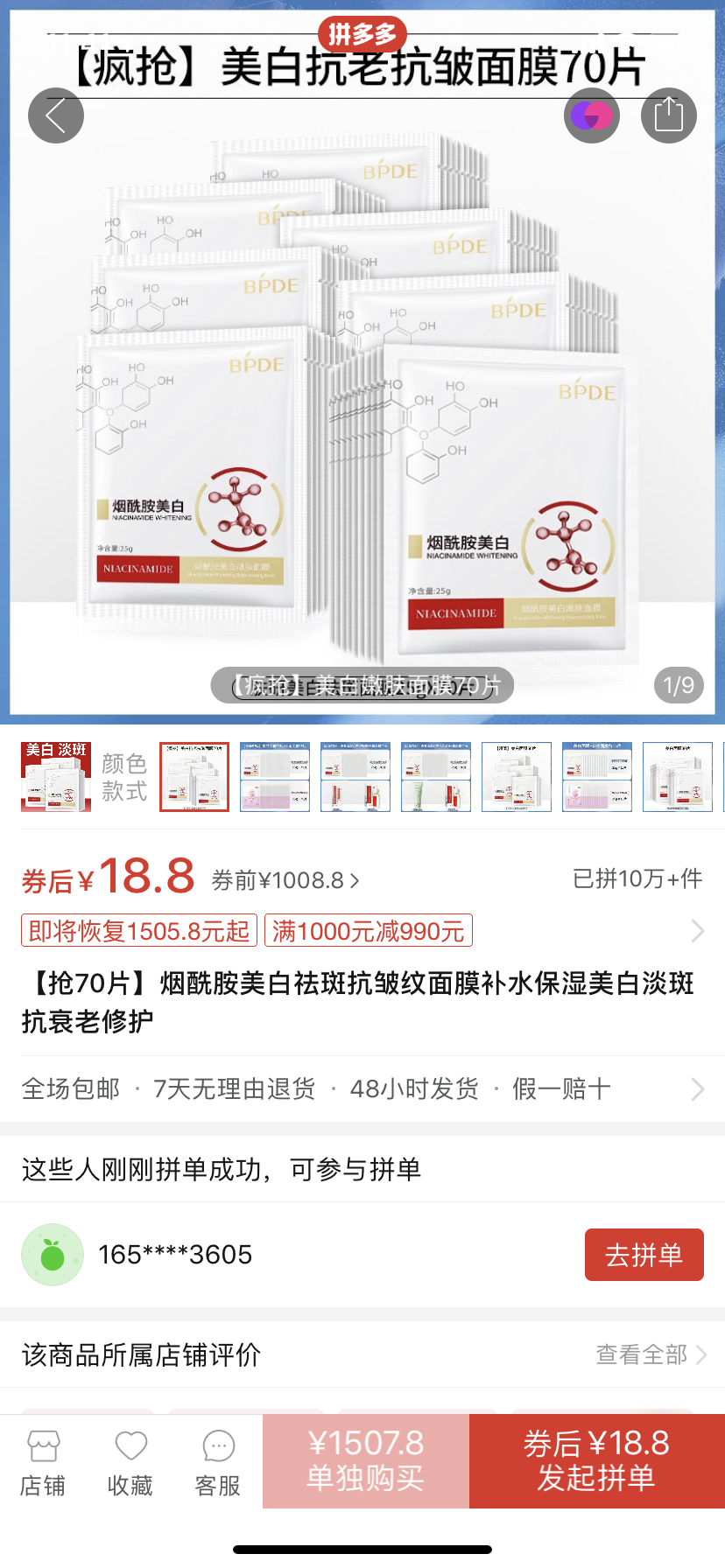 記者還在拼多多發(fā)現,在一家名為良言冬暖美妝工具專營店內,一款名為繽迪膚研美白祛斑面膜39.9元70片,介紹中表明這款產品已經通過藥監(jiān)局備案,是國妝認證的美白產品,具有美白肌膚、淡化黑色素等功,批準文號為國妝特字號G20191510,生產企業(yè)為廣州市愛蓮化妝品有限公司。但記者查詢國產特殊化妝品注冊信息發(fā)現,該批準文號對應的產品名稱是膚研美白祛斑面膜。記者同時也在拼多多上找到了這款名為膚研的美白祛斑面膜,從外包裝上來說和繽迪膚研美白祛斑面膜相差甚大,根據我國特殊用途化妝品“一品一證”的規(guī)定,這種行為涉嫌違規(guī)。但是不管是“李逵”還是“李鬼”,這兩款面膜都有超十萬的銷售額,可見低價還是讓很多消費者心動。