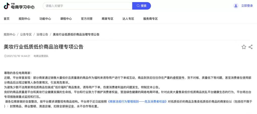 當然,產品“低價”也引發(fā)平臺和品牌的關注。抖音電商近期表示,平臺審查發(fā)現:部分商家通過銷售大量低價且質量差的商品作為福利來誘導用戶進行下單或互動,商品到貨后往往存在嚴重的虛假宣傳、貨不對板、質量低下等問題,甚至消費者在使用部分商品后出現過敏等人身傷害情況,引發(fā)高??驮V。抖音電商更表示,“平臺將出臺專項措施做重點監(jiān)控和打壓。請各位商家做好自查整改,按平臺要求調整現有商品結構。平臺將于近日起按照《商家違規(guī)行為管理規(guī)則——危及消費者權益》對低質低價的商品及售賣低質低價商品的商家處以(包括但不限于):封禁商品、停業(yè)整頓、清退店鋪、扣除全部金、永不合作等處置?!?