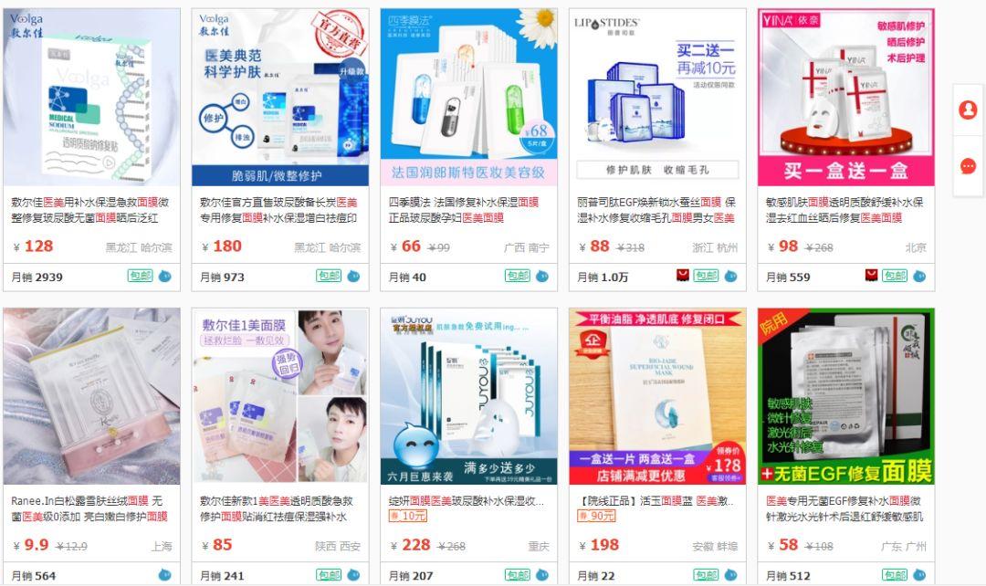 芽芽去淘寶搜了一下,醫(yī)美面膜的市場可以說是魚目混珠了,就拿淘寶首頁的這張圖來說,其實就混雜著各種打著醫(yī)美旗號的“假面膜”。