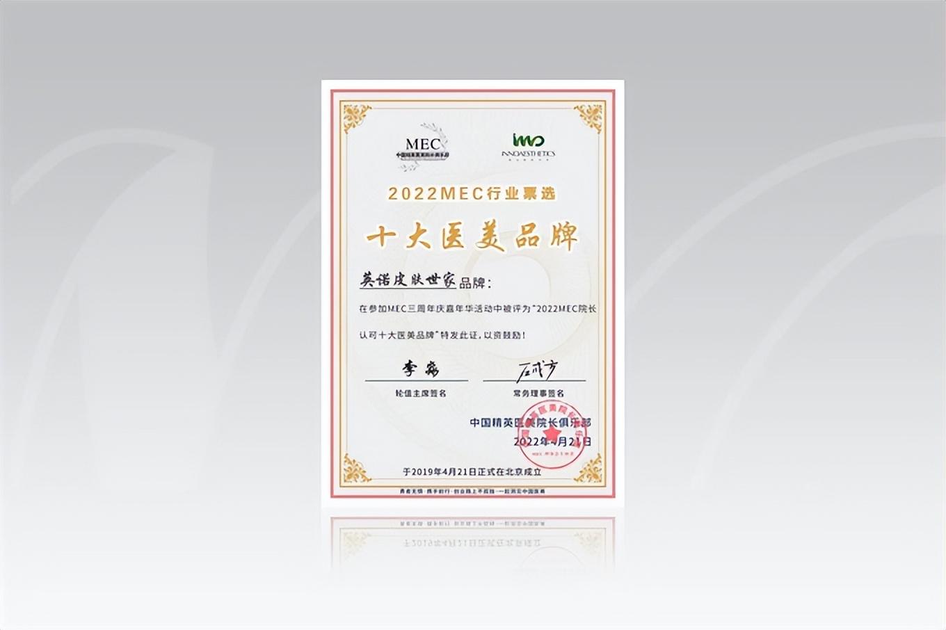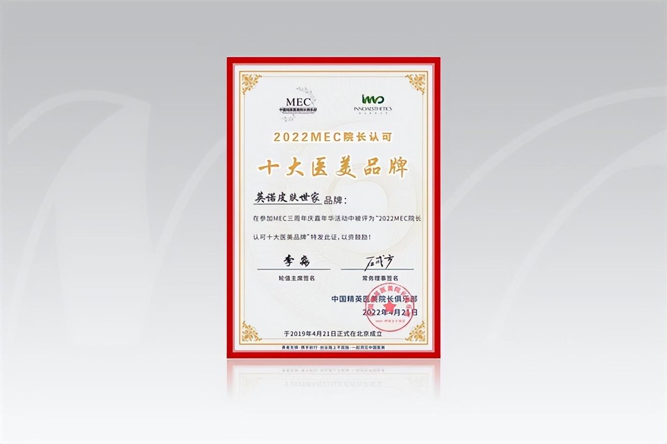 近日,由來自全國各地共17個省市的130余位醫(yī)美創(chuàng)業(yè)院長與專家顧問組成的“中國精英醫(yī)美院長俱樂部”即MEC(以下簡稱MEC)頒發(fā)了《2022院長認可十大口碑品牌》、《2022行業(yè)票選十大口碑品牌》,英諾皮膚世家榮登榜首。