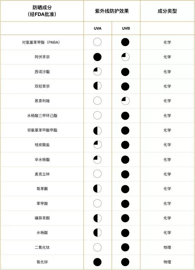 △各種成分對UVA/UVB的防護(hù)果用黑色圓點(diǎn)表示,果隨著圓點(diǎn)黑色面積的減少依次遞減