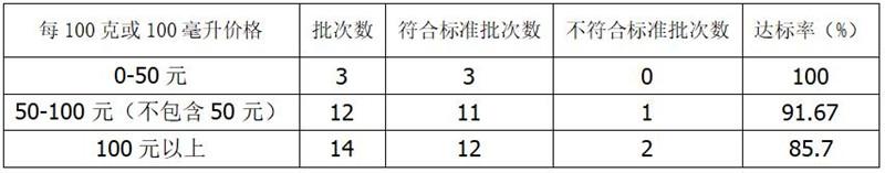 除此之外,在其余的5項(xiàng)檢測(cè)中,本次比較試驗(yàn)29批次樣品均符合相關(guān)規(guī)定的要求。值得注意的是,本次試驗(yàn)購(gòu)買的產(chǎn)品,每100克或毫升的價(jià)格在24.9元至560元不等。不過(guò),經(jīng)檢測(cè)發(fā)現(xiàn),每100克或毫升價(jià)格在100元以上批次的達(dá)標(biāo)率,總體低于每100克或毫升中等價(jià)格(50-100元)和低價(jià)(50元以下)的批次達(dá)標(biāo)率。這表明產(chǎn)品的質(zhì)量與價(jià)格并沒(méi)有直接關(guān)系,關(guān)鍵在于生產(chǎn)企業(yè)是否嚴(yán)格按照有關(guān)規(guī)定要求進(jìn)行規(guī)范生產(chǎn)。