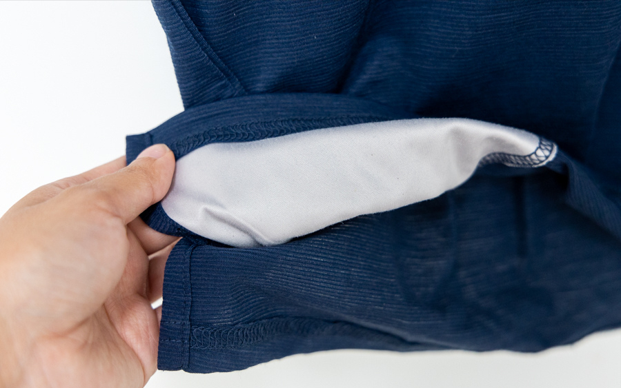 短袖的下擺有不對稱的前短后長剪裁,這個設(shè)計(jì)可以加強(qiáng)身體伸展時的包覆保護(hù)