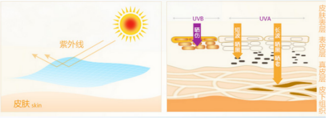 一直都說防曬,那么防曬防的到底是什么呢?其實防曬就是防紫外線,紫外線波長可分為長波(UVA)、中波(UVB)、短波(UVC)。UVA又稱“室內(nèi)紫外線”,可穿透層,破壞膠原及彈力纖維,不但能使皮膚曬黑,而且可造成皮膚失去彈性、出現(xiàn)皺紋。UVB又稱“戶外紫外線”,可達(dá)到層,使皮膚曬傷,引起紅斑、脫皮甚至水皰,可被玻璃、衣服、遮陽傘等阻隔。UVC在臭氧層就被吸收,不會到達(dá)地面。
