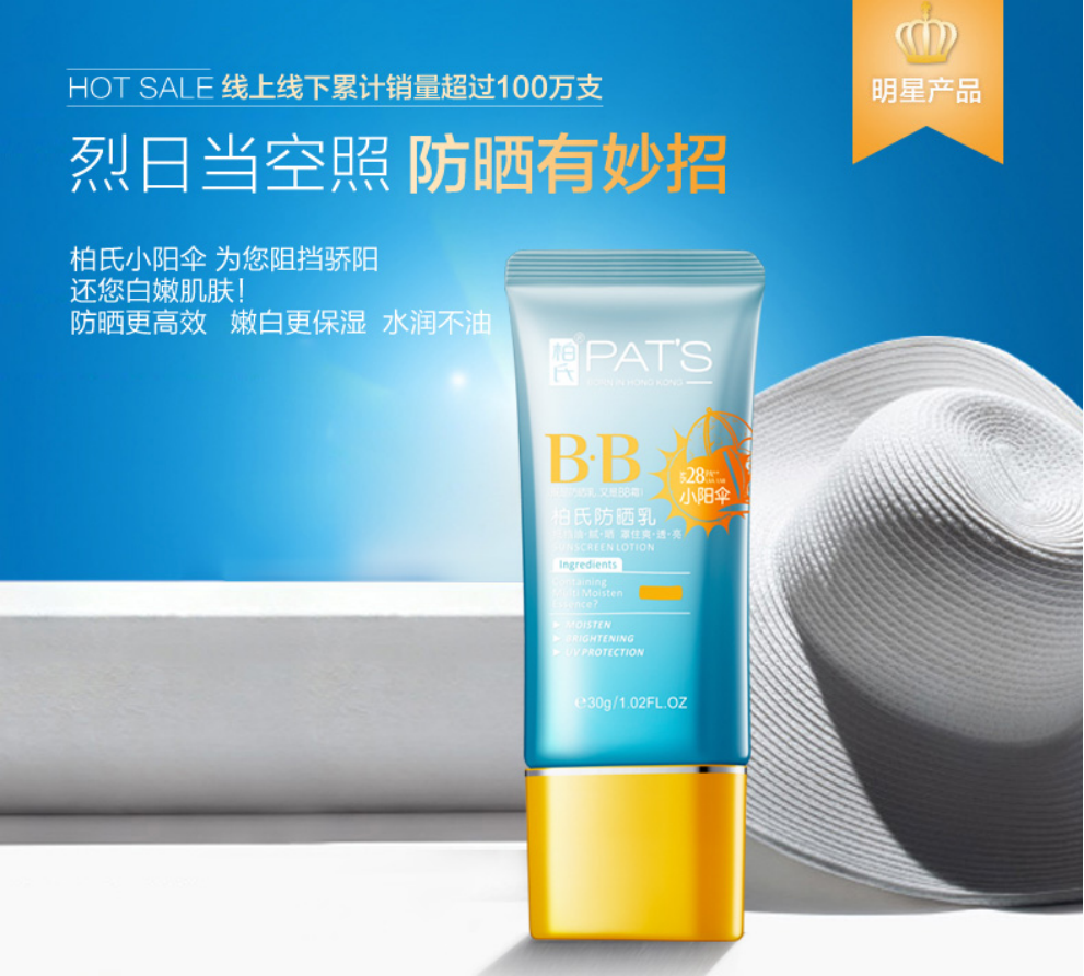 柏氏小陽傘,質(zhì)地輕薄透氣,肌膚呼吸順暢,每日涂抹無負(fù)擔(dān)。它具有SPF28PA++的防曬能力,堪稱全線波長隔離防曬系統(tǒng),仿佛隱形保鏢讓肌膚一整天都能免于紫外線的光輻射。同時具有美顏的果,服帖性強,是一支即可防曬又可美顏的“防曬BB”,并且受到眾多美妝達(dá)人推薦。