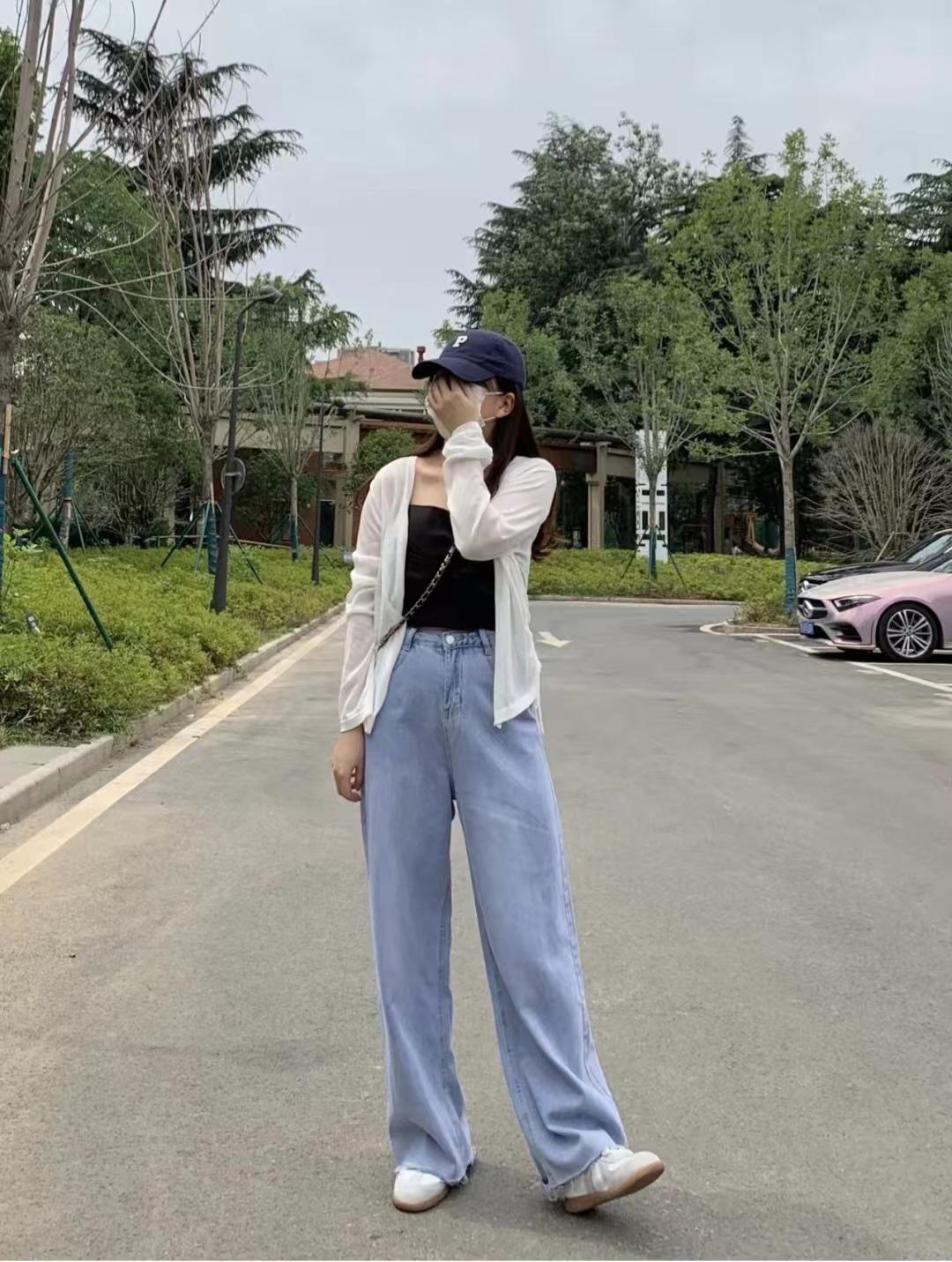 look4 白色防曬小開衫+內(nèi)搭黑色蝴蝶結(jié)吊帶+淺藍色高腰闊腿牛仔褲+德訓(xùn)鞋