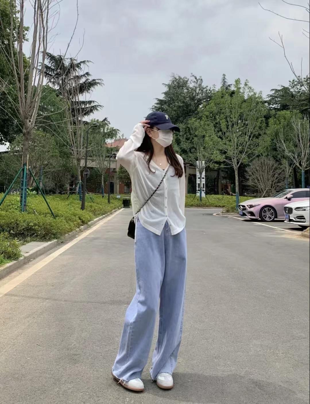 夏季防曬開衫+休閑褲穿搭,內(nèi)里是針織背心打底,一套夏日出行防曬必備單品搭配,下半身搭配米白色高腰休閑褲和瑞典小眾涼拖,打工人簡約大氣通勤穿搭。