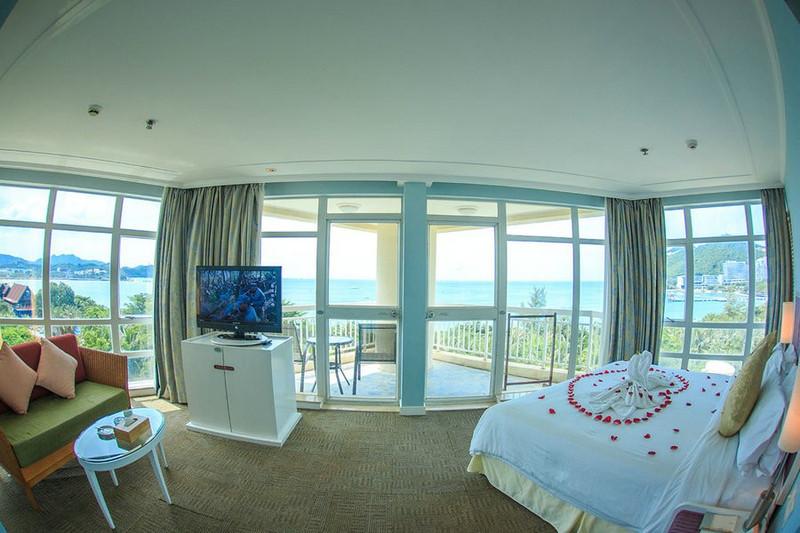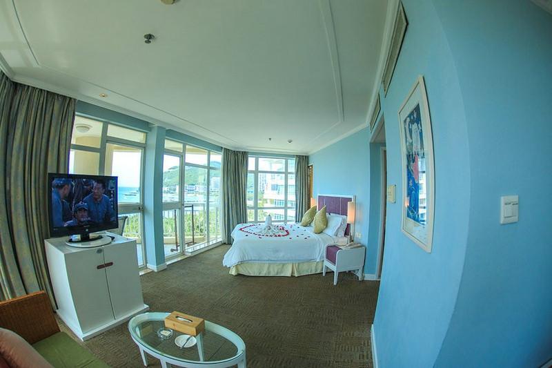 原來酒店的全海景房既是270度海景,房間就佇立在帆型建筑的突出角,站在陽(yáng)臺(tái)上,能看到大東海海灣的每一處海景。