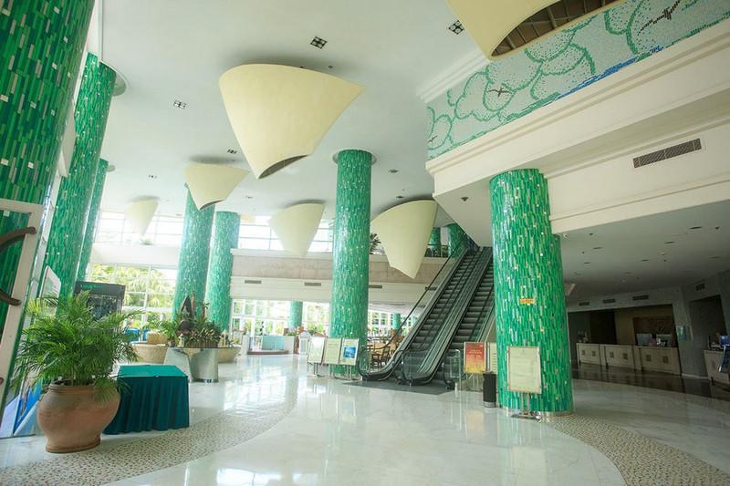 酒店大堂分兩層,光線很好。巨大的柱子貼滿了綠色的長(zhǎng)條形的馬賽克,與窗外的綠色園林相得映彰。前臺(tái)在二樓,乘扶梯上去。