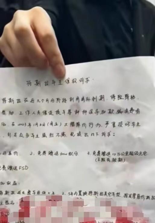 一份按滿了車主手印、用A4紙手寫的“特斯拉車主維權(quán)訴求”正在社交媒體流傳,這些訴求包括“退還差價”,“免費贈送FSD(Full Self-Driving,全自動駕駛系統(tǒng))”,等等——目前FSD的選配價格為6.4萬元人民幣。