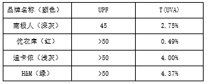 其中,優(yōu)衣庫、卡儂、H&M三個(gè)品牌的防曬衣“超額完成了任務(wù)”:UPF指數(shù)都超過了50,其中優(yōu)衣庫更是將UVA透過率控制在了0.5%以下,雖然四個(gè)品牌的防曬衣在防紫外線功能上都“合格”了,不過在此輪角逐中,優(yōu)衣庫算是“優(yōu)等生”。
